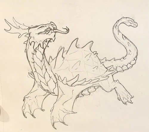 Archelonian Dragons are large, sedentary dragons with spiked shells found in deep waters. Once hatched, these dragons make their way toward the nearest source of water and only leave to find larger bodies of water should they outgrow their current home, or to deposit eggs into a hole dug into sand or soil. Although Archelonian dragons are most often found sleeping at the bottom of their chosen home, they are still known to be dangerous—when awake, these dragons use startlingly fast reflexes to nab prey before retreating back to the depths to sleep. Most Archelonians prefer the sea, but a few have been documented in fresh water reservoirs. They are most active at night, as bright light tends to hurt their eyes.
