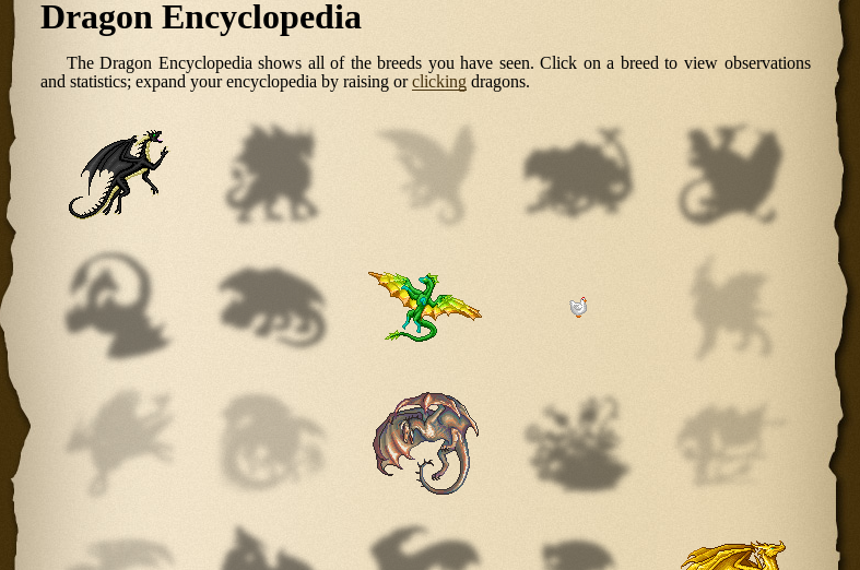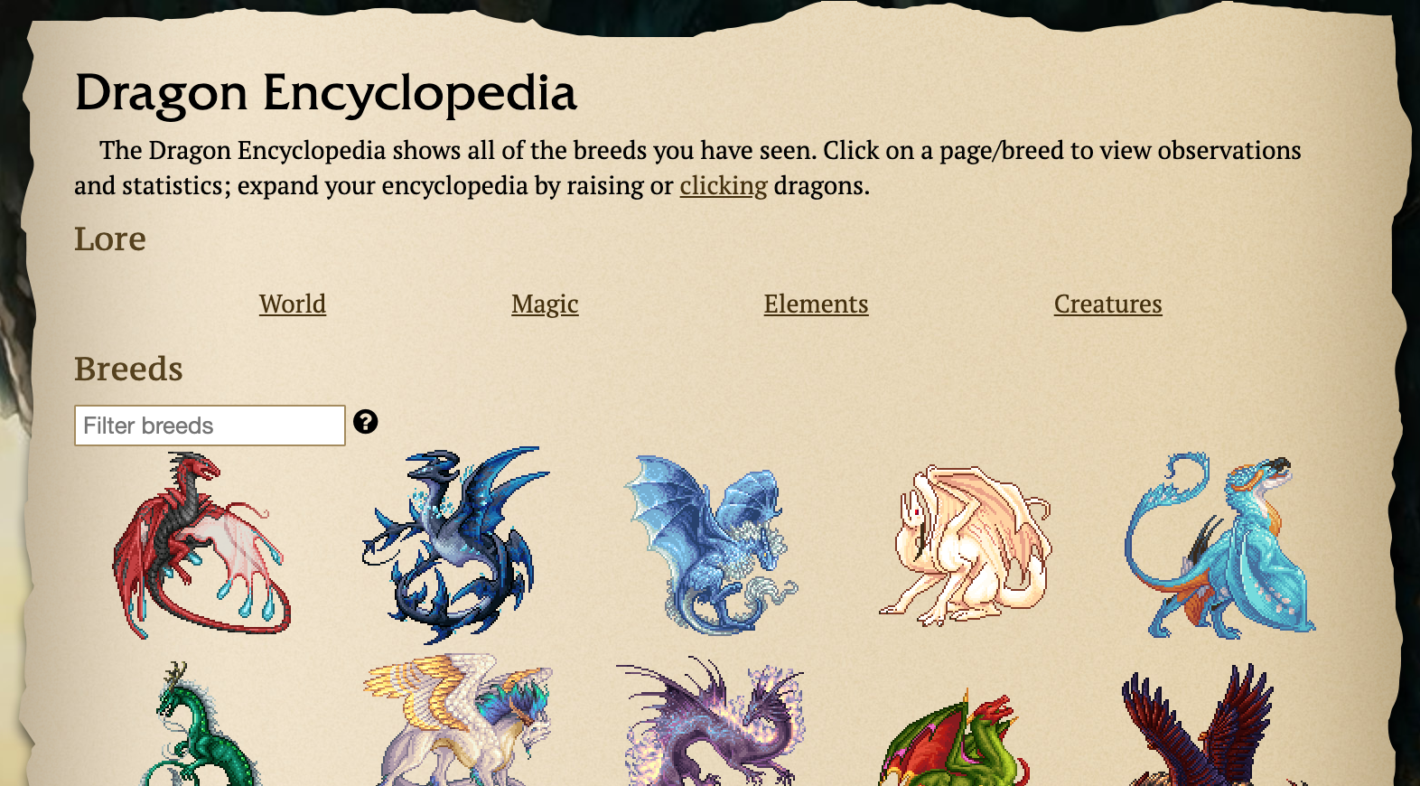 The Dragon Encyclopedia can be accessed by going to Account and clicking "Dragon Encyclopedia". There, the page is divided into two sections: Lore and Breeds. The Lore section provides summaries of the world of Valkemare, Magic and the Elements. The Breeds section lists all of the breeds that the player can view and are linked on a creature's View page. It is sorted alphabetically by breed with non-dragons at the bottom, just like Breed Sort. Breeds first appear as shadows, and their encyclopedia information isn't immediately available. They must be unlocked first - by viewing, acquiring or raising creatures of that breed - before their names, sprites, and full information become visible.