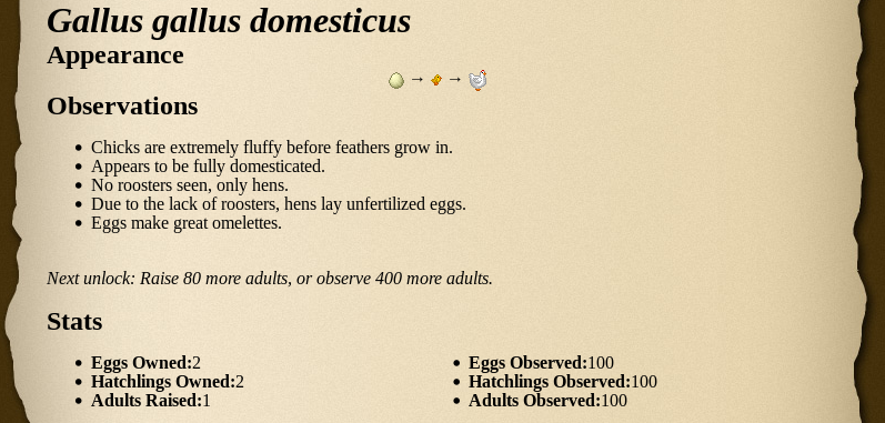 As you "observe" (view via Clicks) or raise different breeds, you will get more information about each one. The amount of information a creature has in the encyclopedia varies, and the number the player has to own/observe also varies. It is usually a small number, but breeds like the Chicken require viewing of hundreds of specimens to unlock the full entry. All sprites need to be viewed separately to be unlocked. Any alternatives (alts) or variations of dragons require observing the alt or variation version of the dragon to unlock the sprite.