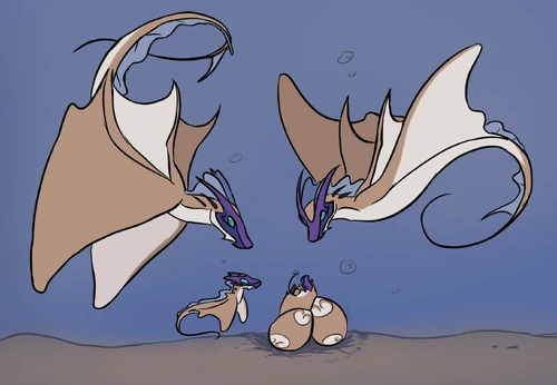 Painted Rays have venomous spines along their necks that they use primarily for defense. These spines grow in as they mature and are only potent once they reach adulthood. The venom won't kill anything bigger than them, but it'll make whatever is stung sick long enough for them to make their escape. The spines detach easily and will regrow fully within just a few weeks. Their tails they use like whips to stun small fish. Babies can eat fish right out of the egg, but might need it to be torn into smaller bite sized pieces first. Groups of Painted Rays will often nest in the same area since that will be where the ideal water temperature is for their eggs, creating a pygmy kindergarten for all the eggs and newborns. Their wings are too thick and heavy to fly in the air, but adults can leap out of the water with enough force to glide for a bit above the water. Babies can be seen trying to practice this behavior and belly flopping at the surface, especially during the rain. They love to play in the rain.