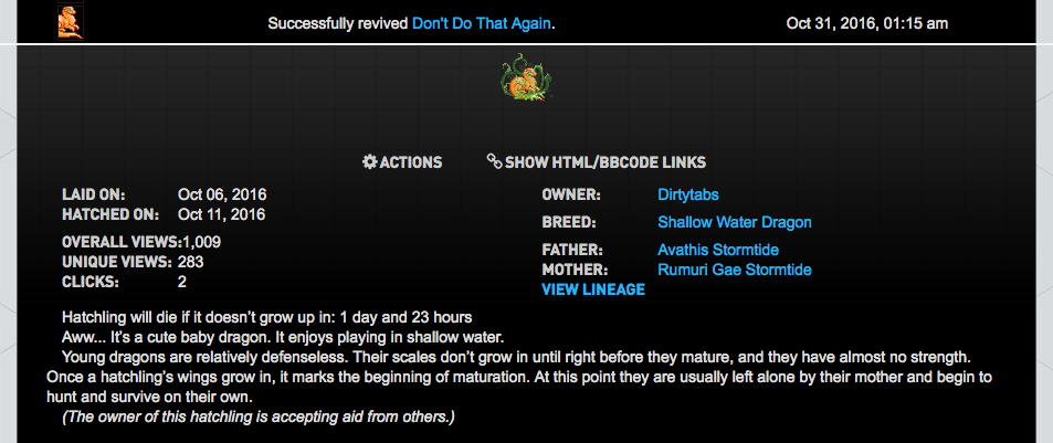 Revive is an action that can only be done on dead hatchlings and dead adults. In-game, the player casts a magic spell in an attempt to revive a dead creature.