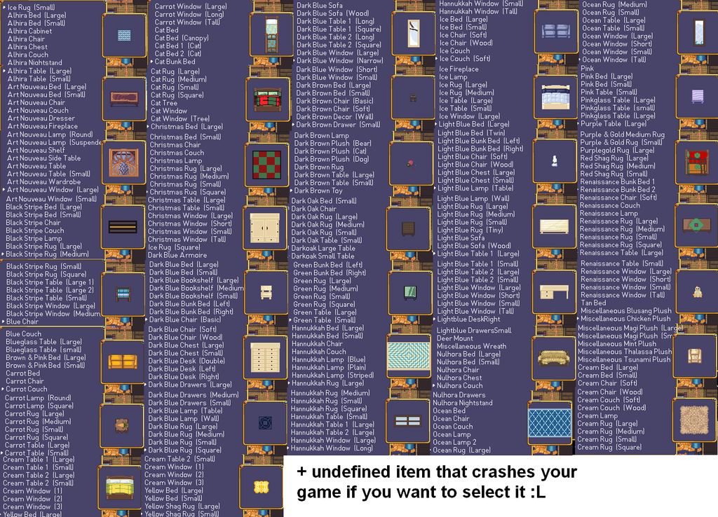 In this game, players were rewarded after each quest with items they could use to decorate their house with. The items given as a reward were random, so different players received different items until the game was complete and all items were collected. The list of all 288 possible and known items (accurate as of 05 January) are given below: